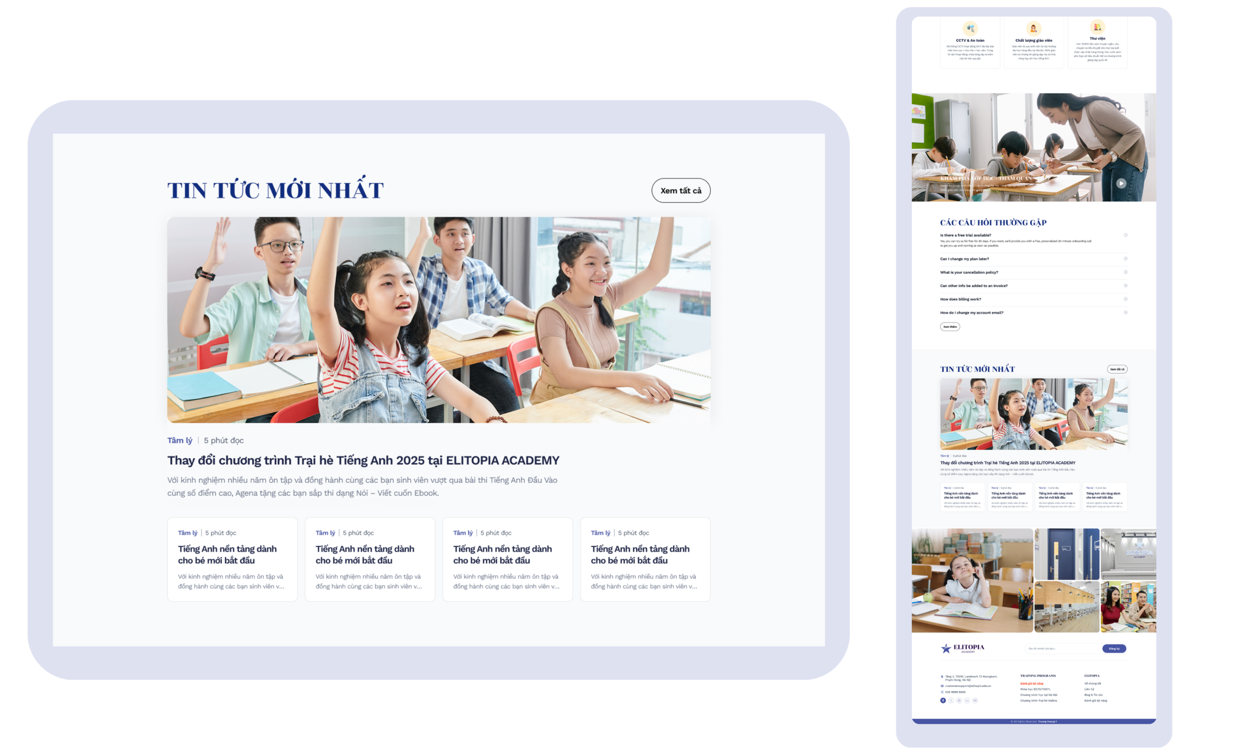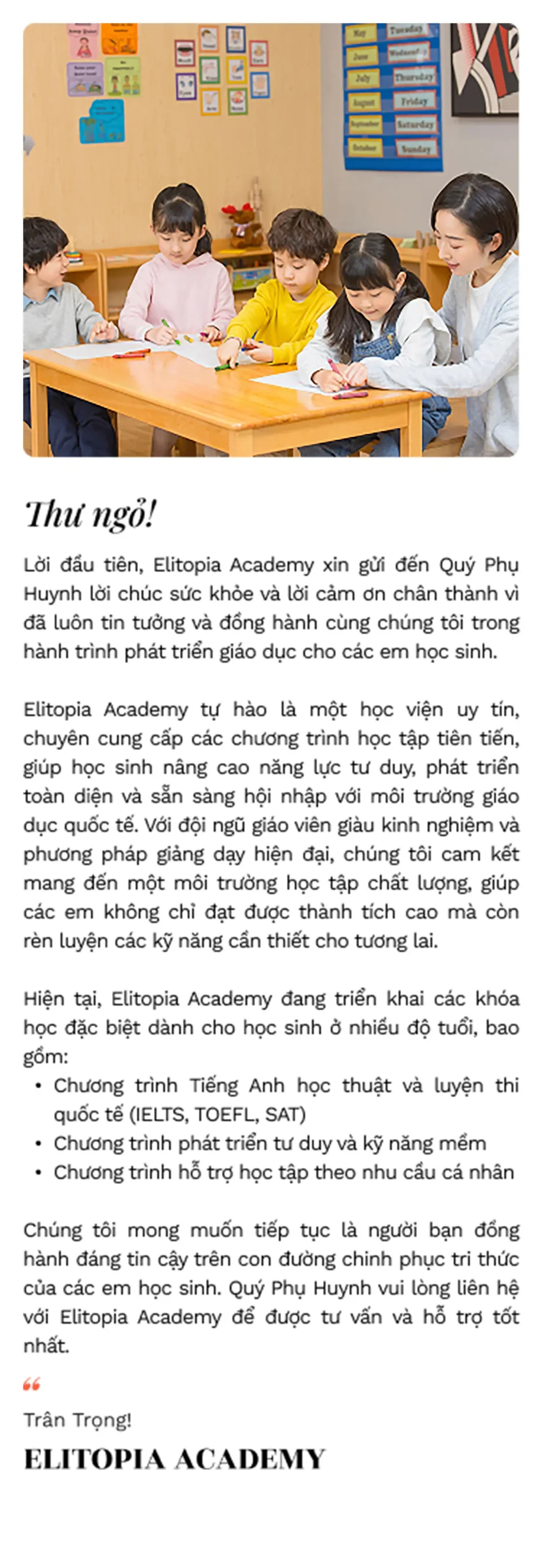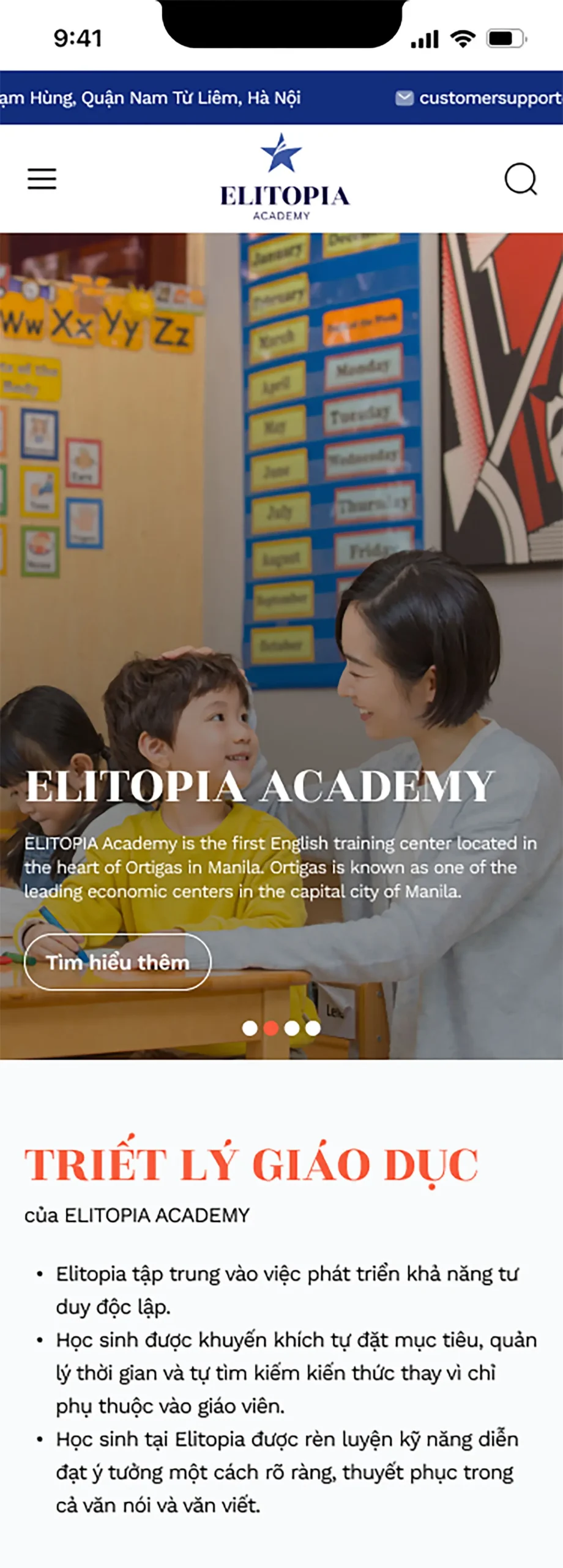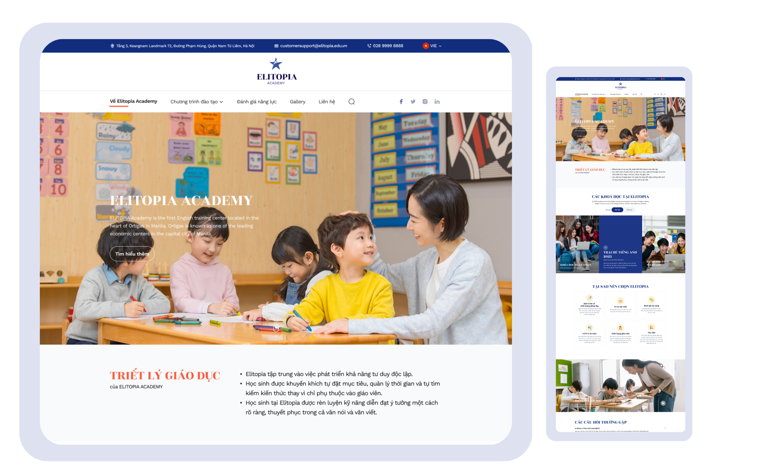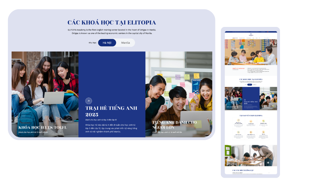 Elitopia Academy là môi trường giáo dục quốc tế, nơi đồng hành cùng hàng ngàn học viên trên hành trình chinh phục tri thức và hội nhập toàn cầu. Với nhiều năm kinh nghiệm giảng dạy và phát triển chương trình đào tạo, Elitopia không ngừng khẳng định vị thế là một trong những học viện Anh ngữ uy tín. Bước sang năm 2025, Elitopia Academy triển khai chiến lược làm mới thương hiệu trực tuyến, xây dựng nền tảng số hiện đại, trong đó website giữ vai trò trung tâm để kết nối, tuyển sinh và lan tỏa triết lý giáo dục đến cộng đồng học viên trẻ.
