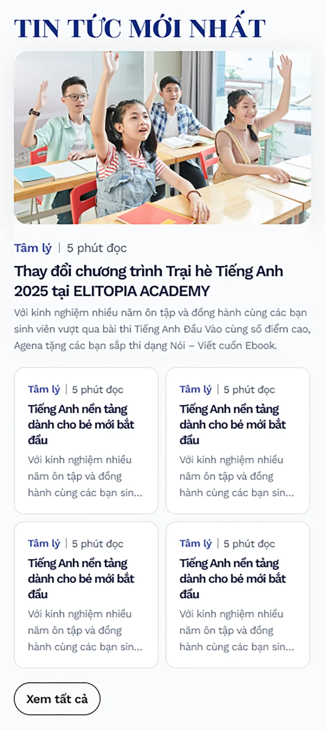 Elitopia mong muốn xây dựng một website học thuật ,chuyên nghiệp, trẻ trung, phản ánh đúng tinh thần giáo dục và môi trường đào tạo quốc tế của mình. Mục tiêu của Elitopia là tạo ra một nền tảng trực tuyến vừa tin cậy, vừa truyền cảm hứng cho học viên và phụ huynh, trong đó giao diện được thiết kế tinh gọn, hiện đại, lấy màu xanh navy làm chủ đạo, kết hợp sắc trắng, xanh nhạt và điểm nhấn vàng để toát lên sự tin cậy, năng động và thân thiện. Bố cục website cần rõ ràng, phân tầng nội dung hợp lý từ phần giới thiệu, chương trình học, lý do lựa chọn Elitopia cho đến tin tức, hình ảnh và liên hệ. Ngoài ra, Elitopia đặc biệt chú trọng trải nghiệm người dùng: dễ tìm kiếm thông tin, dễ thao tác trên cả desktop lẫn mobile, cùng với hệ thống hình ảnh chân thực để tạo sự gần gũi, tin cậy và khác biệt trong truyền thông tuyển sinh.